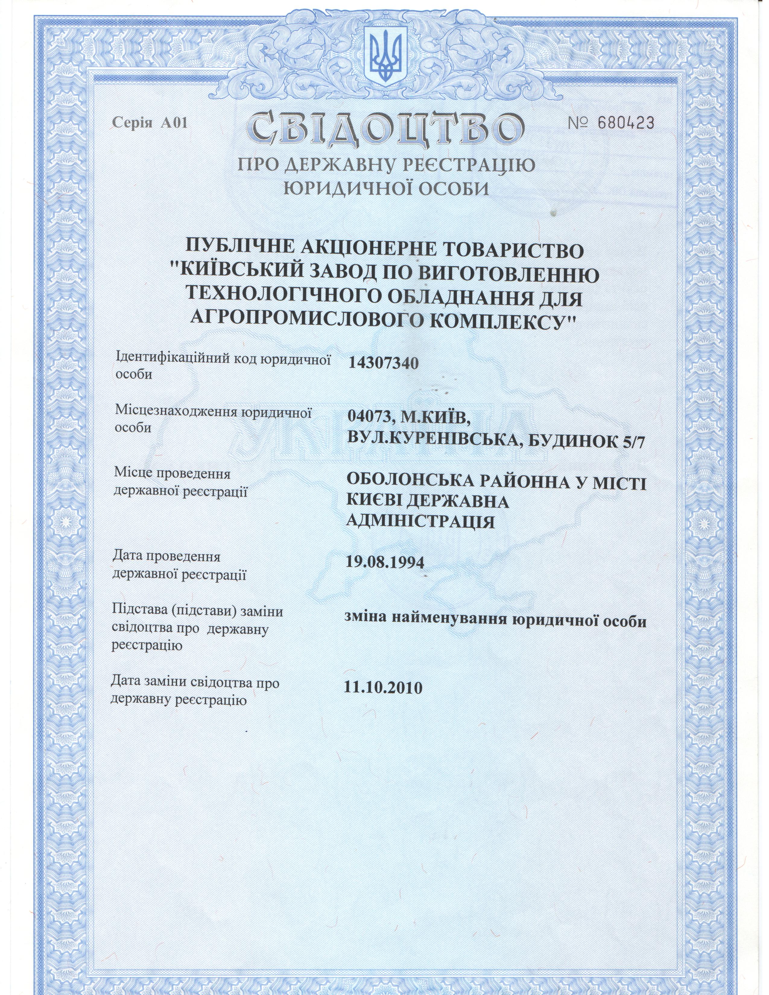 Свідоцтво про державну реєстрацію (І сторінка) - 19.08.1994